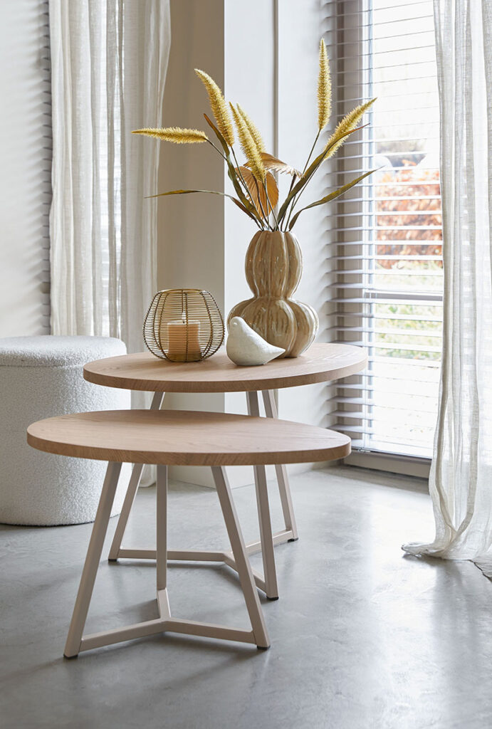 Wil je een speels effect creëren? Ga dan voor meerdere tafeltjes bij elkaar. Dat geeft je interieur een luchtige uitstraling én is superpraktisch. Heb je visite? Dan schuif je ze makkelijk uit elkaar. Is het weer rustig in huis? Dan schuif je ze compact samen en win je direct ruimte terug.
