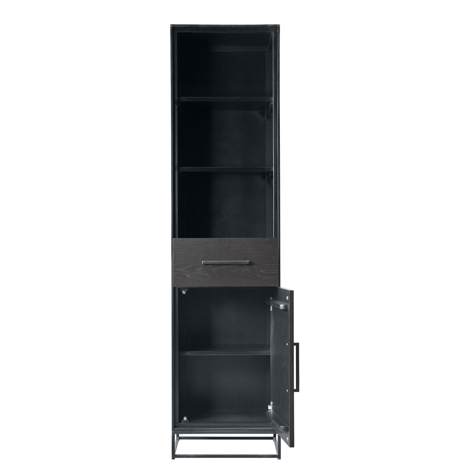 Industriƫle boekenkast uitgevoerd in eiken fineer zwart met 3 open vakken, 1 lade (met soft-close systeem) en 1 deur met visgraat motief. De open vakken zitten bovenin en zijn 29cm hoog en 43cm breed. De totale afmetingen van de kast zijn H193xB49xD40. Een ideale kast om spullen zichtbaar en niet-zichtbaar in op te bergen. De boekenkast wordt gemonteerd geleverd en is daarnaast leverbaar in de kleur naturel of met een extra deur bovenin.