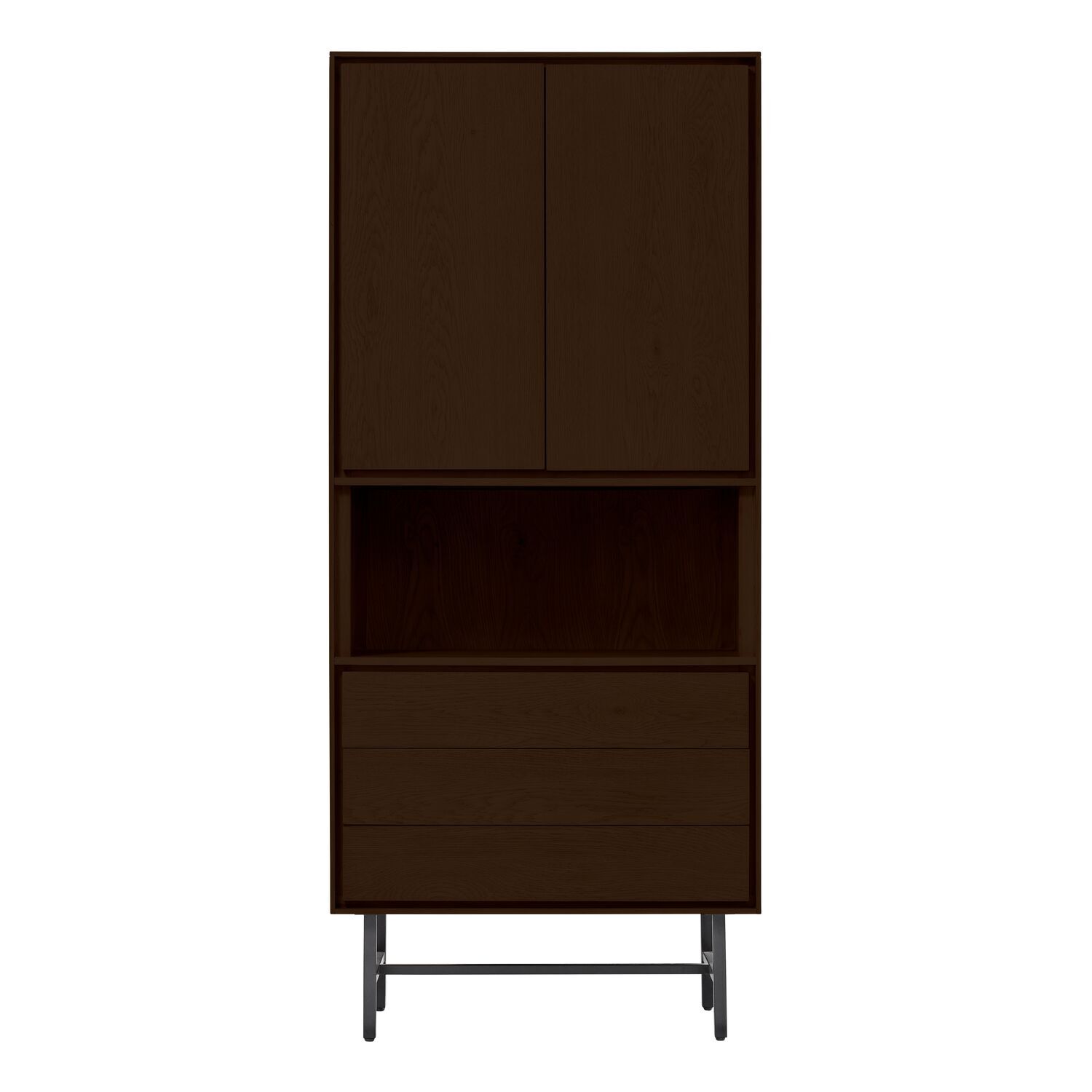 | Uitvoering | Uitgevoerd in dark oak veneer met een metalen frame met 2 deuren, 3 laden en 1 open vak. OP=OP |