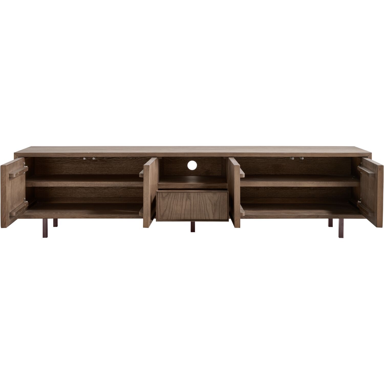 Met een hoogte van 50cm, breedte van 205cm en diepte van 40cm biedt tv-meubel Calvo veel ruimte voor je apparatuur en accessoires. Achter beide dubbele deuren bevindt zich één brede plank voor het overzichtelijk opbergen van spullen. De lade is ideaal voor kleinere items en het open vak is voorzien van een ronde opening voor de kabeldoorvoer, zodat snoeren netjes uit het zicht blijven. Dankzij het push to open-systeem openen en sluiten de fronten eenvoudig met een lichte druk. Het meubel wordt volledig gemonteerd geleverd, zodat je het direct kunt plaatsen en inrichten.