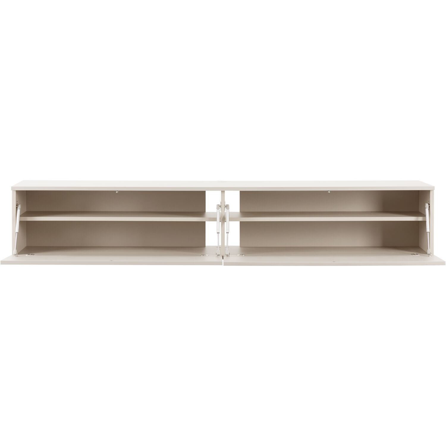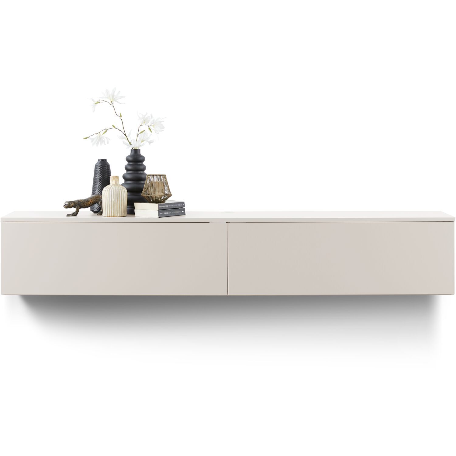 Hangende tv-meubels zijn helemaal van nu. Ze ogen ruimtelijk, modern en geven je interieur een opgeruimde uitstraling. Dit royale model heeft een glad gelakte afwerking in zandgrijs, een warme grijstint met natuurlijke uitstraling. De kleur geeft het meubel een rustige, stijlvolle uitstraling die in elk interieur tot zijn recht komt.